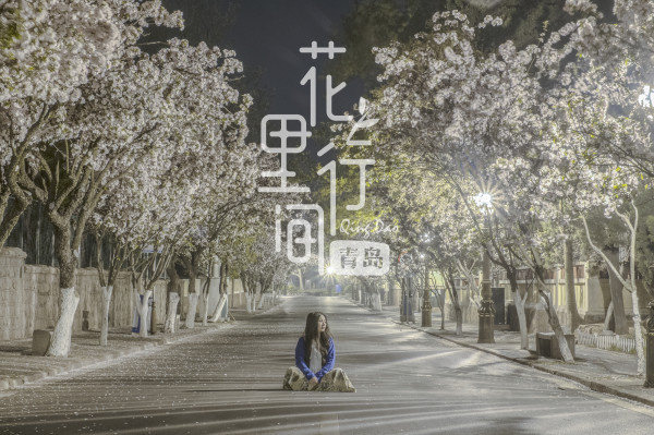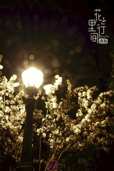 八大关夜晚空无一人的夜景,两边是雪白的樱花,美么