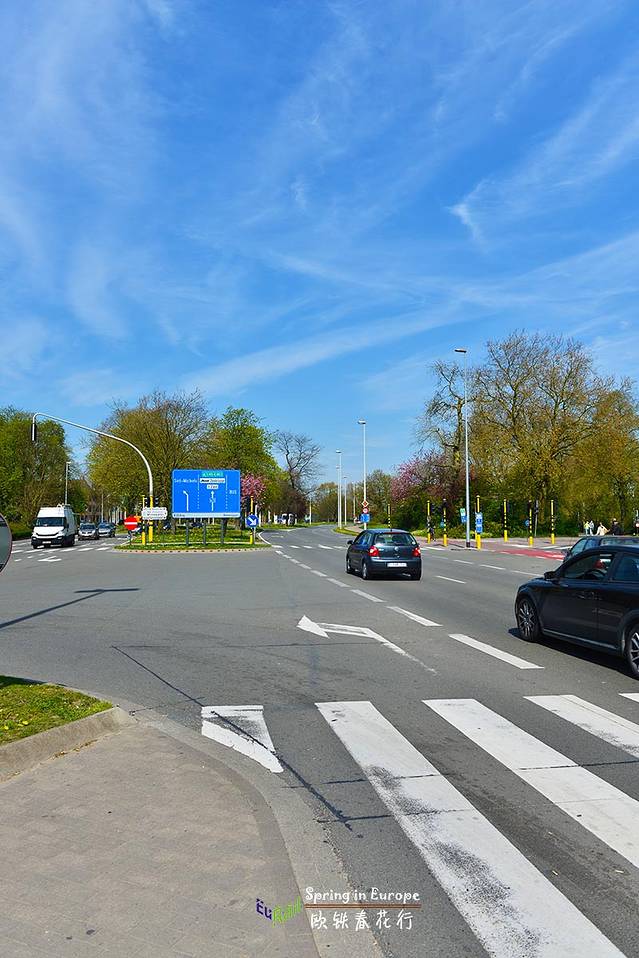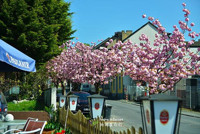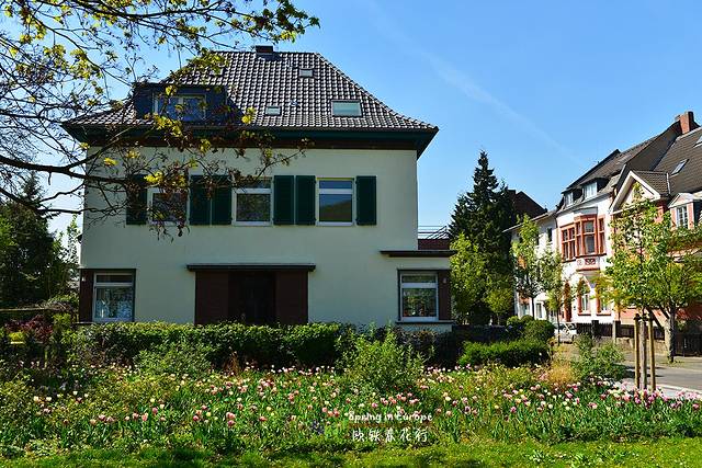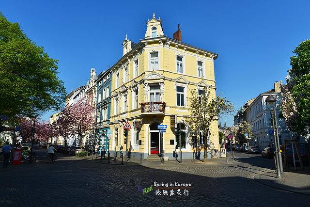 看到这栋奶黄色的三层漂亮建筑,我们就来到了波恩樱花大街的起点。所谓樱花大街,一般就是指的Heerstraße大街,而Heerstraße并非整条街都是樱花街,只是在这个十字路口向东北才是两旁种满樱花行道树的。