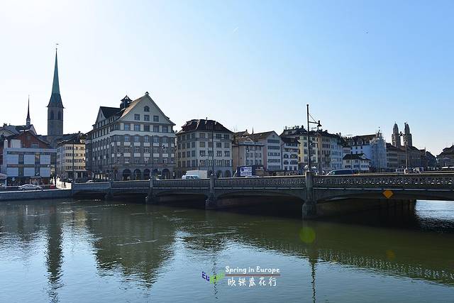 我们先沿着利马特河的西岸从火车站向苏黎世湖走去,岸边的老树都已经发出了新叶,把河对岸的教堂掩映得幽美典雅。