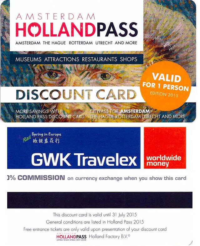 由于参观库肯霍夫公园计划用时五六个小时,因此当天清早就要从海牙的酒店出发,所以之前一天在海牙中央火车站的GWK银行兑换了HollandPass,我买的小套是有两张郁金香券,两张风车券与一张公共交通券。当时在柜台直接用一张风车券兑换了莱顿到库肯霍夫的巴士票,一张风车券兑换了海牙市区内24小时巴士票。