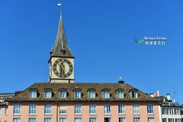 圣彼得大教堂是苏黎世最古老的教堂,始建于1534年的教堂塔钟楼上有欧洲最大的教堂钟指针盘,钟的盘面直径有8.7米,时针长3米,分针长4米。这个教堂塔用于监视火灾的,据说一旦发生火警,就有人把一面旗伸向发生火灾的方向,以此告诉人们救火的位置。教堂前的屋顶上,有鸟巢和鸟儿在晨光里鹤立。