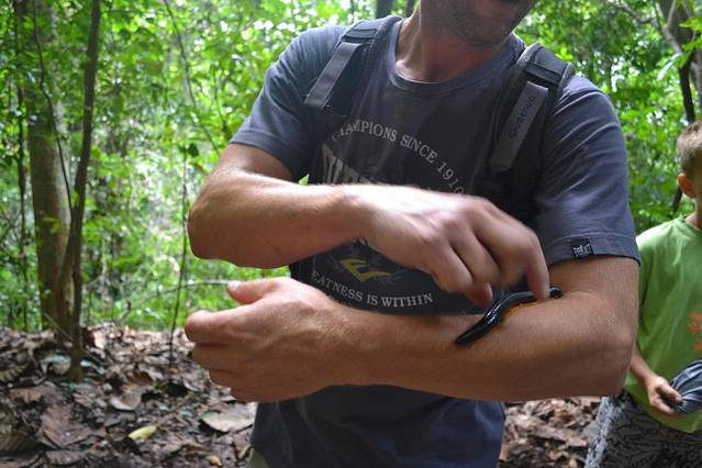在他们正在搞定菠萝蜜的时候,只听我一声尖叫,感觉脚上有东西,蹲下身子,脚踝处,露出一条尾巴,好似挣扎般四处的扭动,而这虫子的头已经深深地埋在肉里,再仔细看,貌似不是在挣扎,而是想往里钻的冲动,看在旁边的孩子们都毛骨悚然!