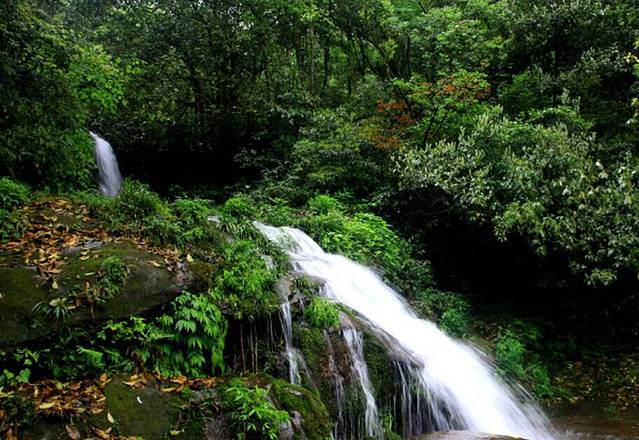 水声随着步伐的前进,而变得愈来愈响,叮咚叮咚的奏着欢快的乐章,跨过山溪中的巨石,在一处山岩边伫足,眼前已是豁然开朗。只见鸿濛一团的世界中,在山峦与苍天的交界处,透出一方白茫茫的天空,一条如薄纱、似白练的瀑布高悬,经过几个落差点,顺着山崖飞流而来。水声喧哗,水珠四溅,挟着阵阵清凉,汇成一泓清澈见底的山潭。好水,不由自主,掬了一捧品尝,凉津津的,甘冽沁人。