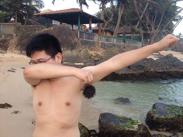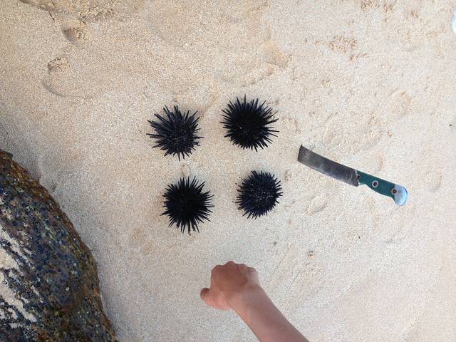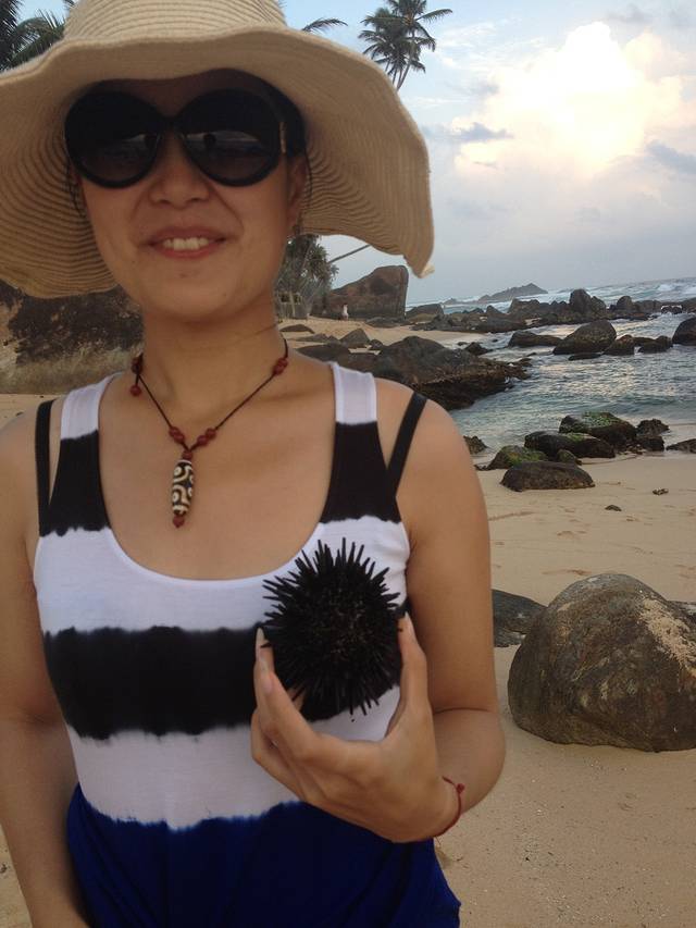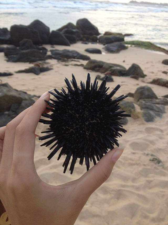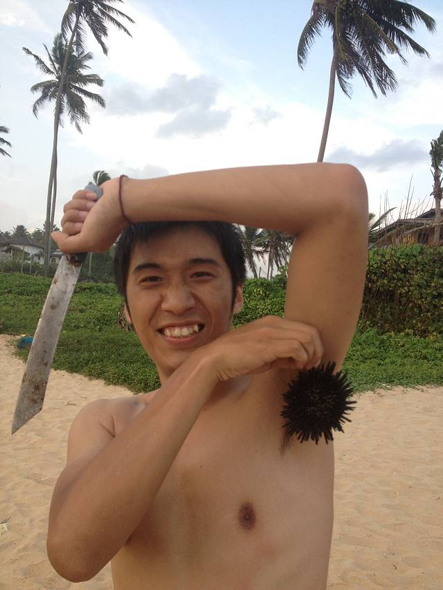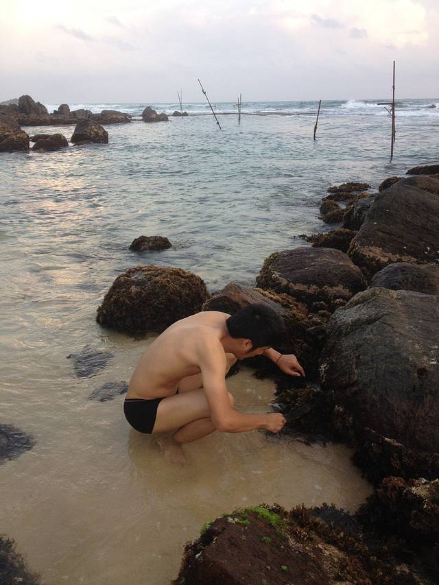 陶先生和大杉在海边的几天基本处于玩儿疯状态。捉小螃蟹、海胆、寄居蟹,海滩上的惊喜一个接一个,硕大的海胆在手里蠕动,我还从来没见过呢~陶先生操练着一口兰卡味道的英文,比比划划的竟然从海边的老乡家里借到了一把大刀!用来深入挖掘海里的宝贝们。。。
