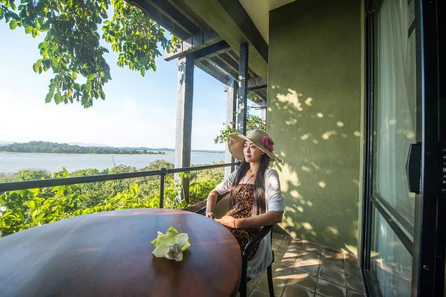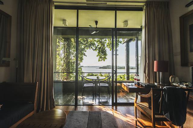 进入房间,就能看到外面开阔的风景,偶尔会看到大象在水边缓慢的踱步。房间落地玻璃门上贴着“当心猴子”,我们还很诧异为什么要当心猴子呢?!