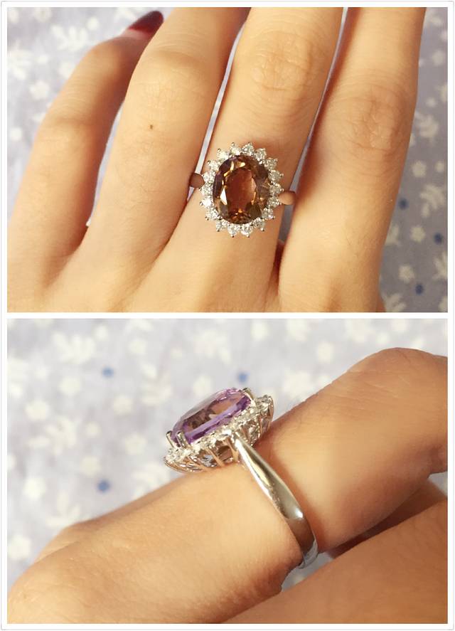回家后,我花了大价钱把这颗紫黄晶镶嵌了,18k金配一圈钻,戴妃款,天啊,成本不知道比这个石头高多少。