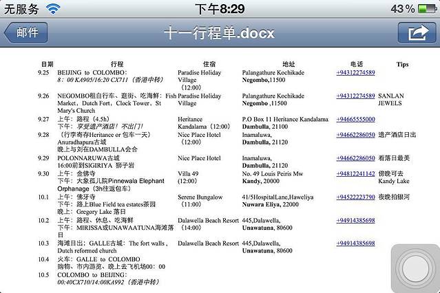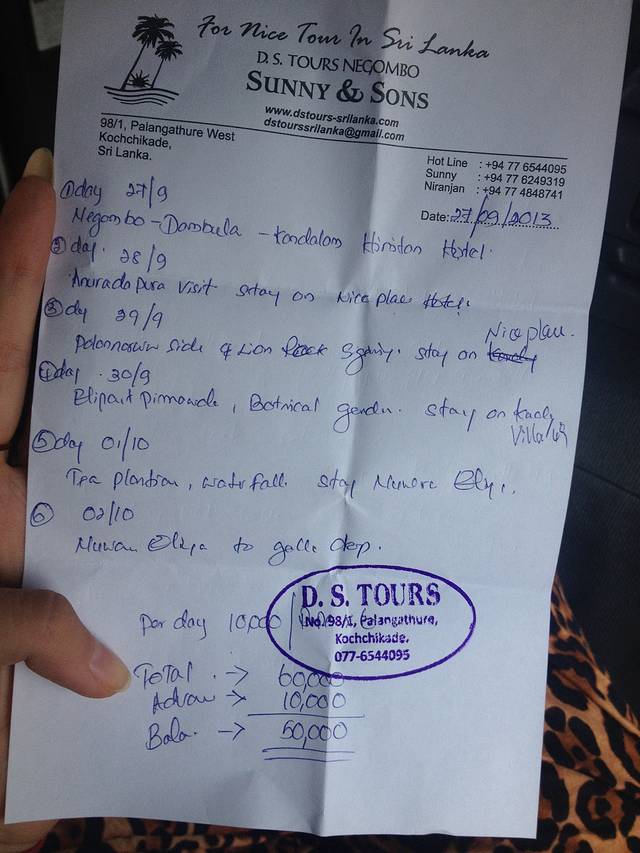我们所有的住宿都是在网上定的,然后按照日期把订单都打印出来,订好,带着!事实证明非常有用,订单上面有地址电话,斯里兰卡很多人英语并不好,所以直接看这个比较清楚明白。