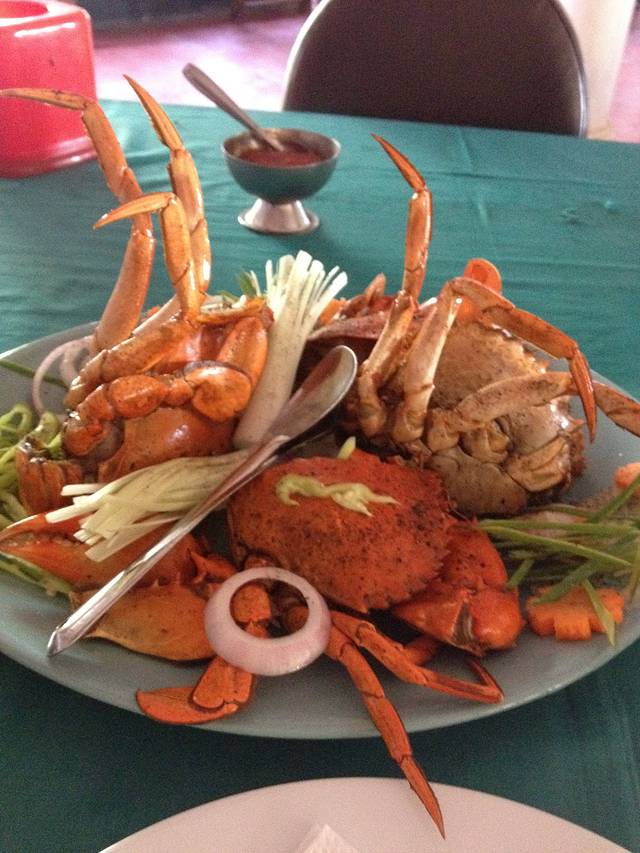 大螃蟹!鱼市场早晨比较热闹,中午的时候已经快收摊儿了,我们看到一个老阿姨再卖大螃蟹!留着哈喇子就过去了,螃蟹合人民币不到15块钱一只吧,我俩买了四只,到鱼市场旁边的饭店加工一下,开吃!