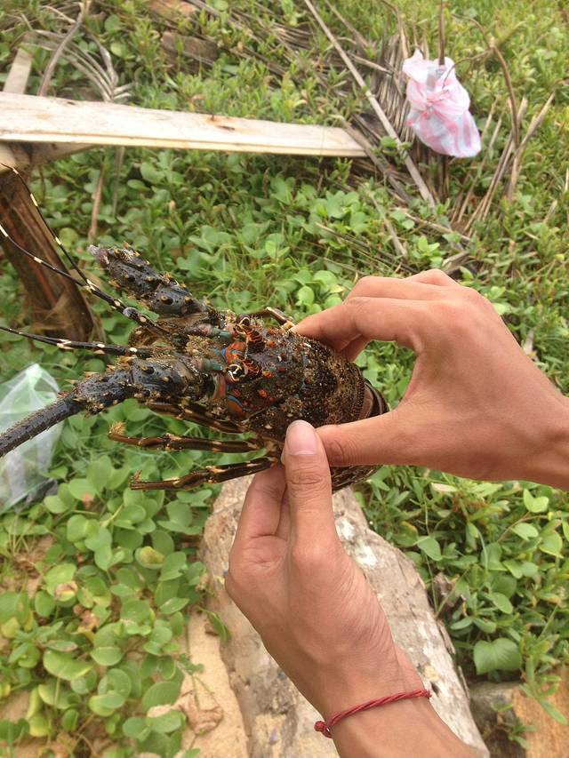 第二天一早,我和陶先生如约来到渔民家里,大杉不爱吃海鲜就在屋里睡懒觉了。当渔民家的男主人拿出龙虾时候我俩真是惊住了,这么漂亮鲜活、精神奕奕的龙虾啊!男主人说这三只是他早上3点钟出海打回来的,我俩心里着实有些感动。