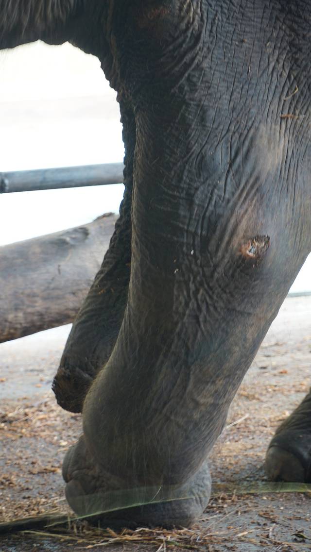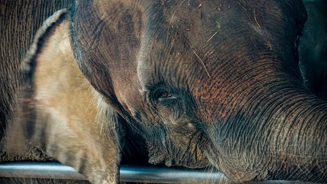 这只斜斜依靠在栏杆上的大象,腿部受伤站不起来,仿佛能看到他眼中的泪水。