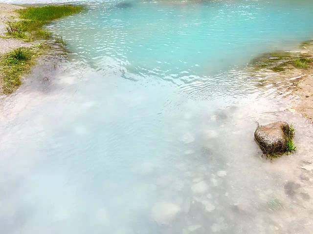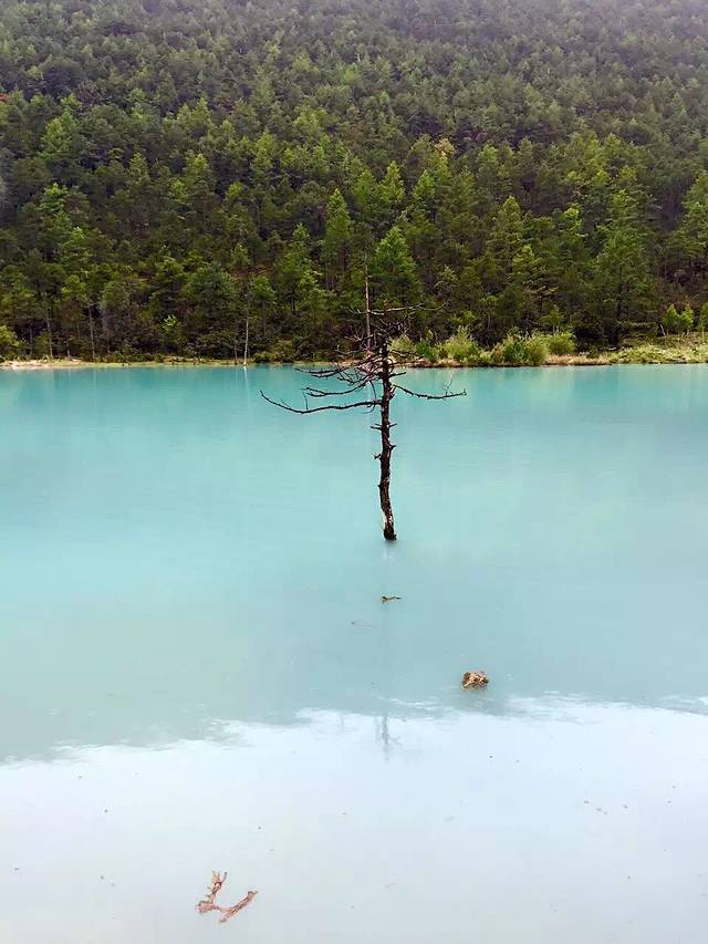 用宝贝儿的形容是:这是粉蓝色的,是天蓝色的水里掺入了少量的纯牛奶。我当场表扬了她的丰富想象力。同时也不忘向她的小脑袋瓜普及科学知识:玉龙雪山中含有硫酸铜,随高山融水流到蓝月谷,硫酸铜遇水后就会变蓝色。