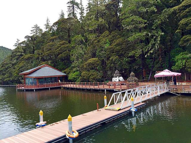 开始有点遗憾于如此美景没有蓝天白云相伴,少了一份明媚。可看到连绵起伏的山脉上萦绕着一团又一团散不开的雾气,与这青山、绿水为伴,为香格里拉凭添了一份神秘之美,整个普达措像一幅惊世脱俗的水墨画,不同的意境、不同的心绪,转瞬又开始感谢老天爷的安排。
