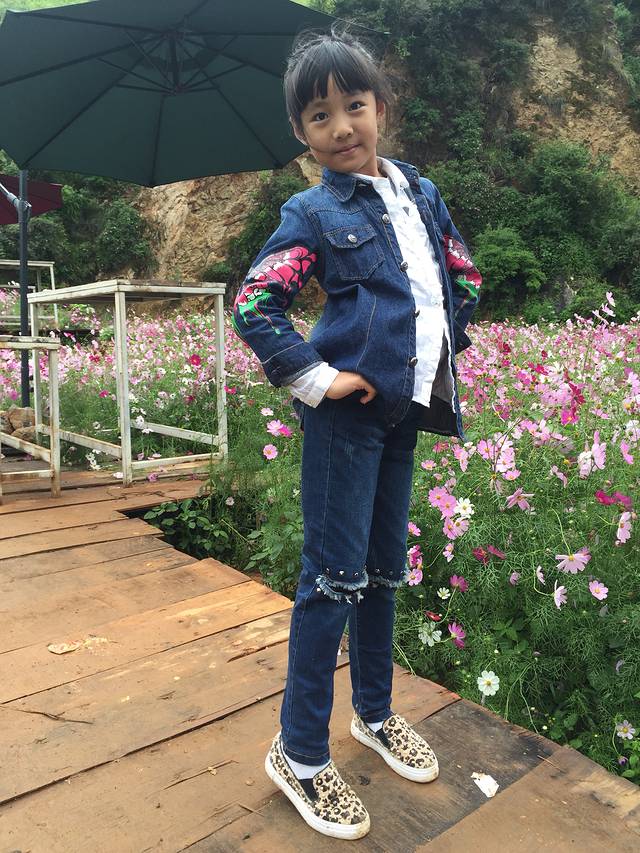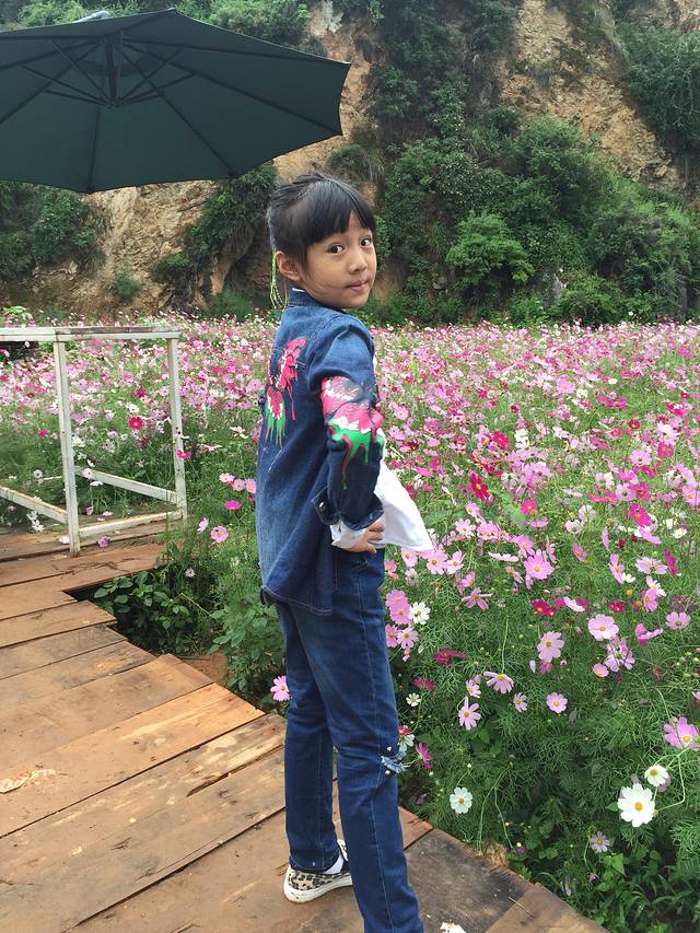 小女生今天着装是帅气风,与这片花海倒是有些违和感。