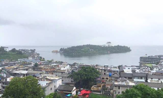 这个是双廊全景,我站在高高的马路边拍的,烟雨濛濛的感觉。与下图度娘里找的双廊图片太像了,应该是在一个位置拍的,只是它是蓝天白云碧海。