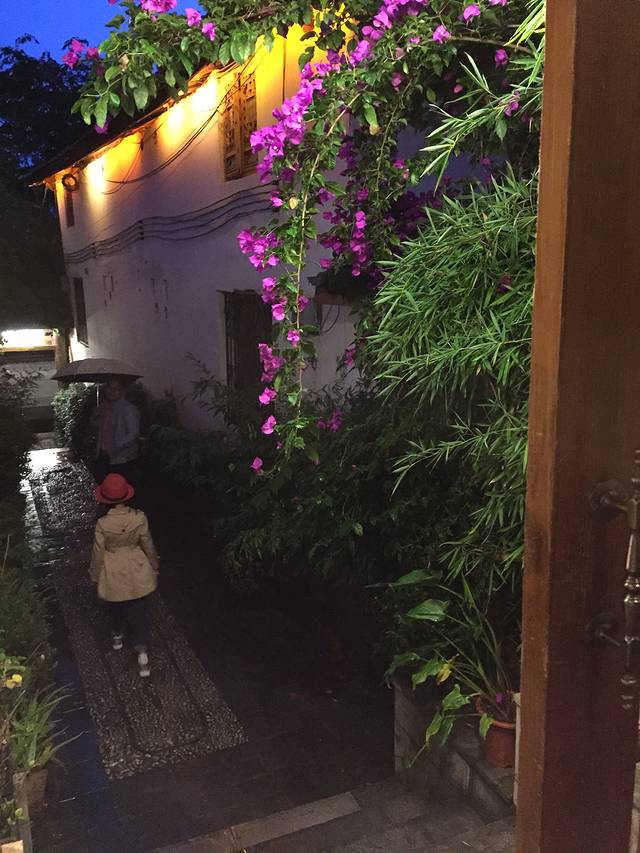 客栈正门口,一株开得繁茂的三角梅笔直垂下来,迎来送往客栈里的游客,好精致的景!