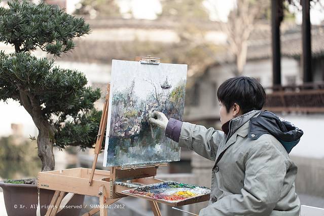 这里是苏州的留园,冬天的留园,以及冬天里在留园里画画的画家。