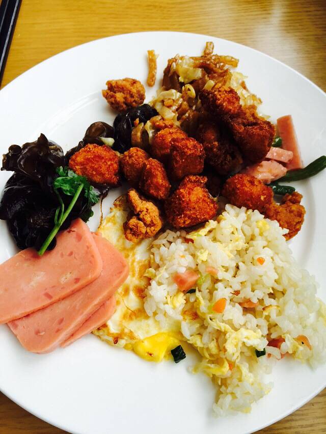 酒店的早餐,外加一碗小馄饨和一盘水果,早上吃这些会不会有点多