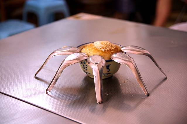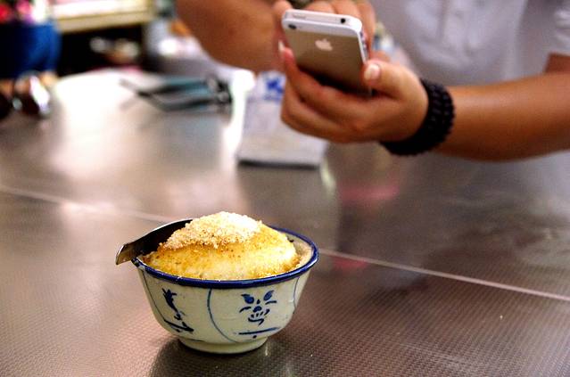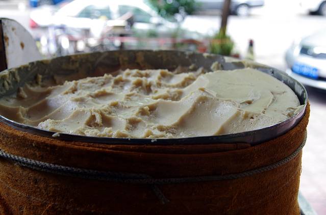 跟之前一样雷人,我们一行6人(男导游有事先走了)点了一碗豆花,此举让足以让老板娘汗颜。吃货团成员每人一个勺子品尝豆花,这里的豆花跟我们平时吃到的有些差别,豆味特别浓郁,口感特别特别特别粘稠,配上金黄色的糖粉,满嘴香甜。