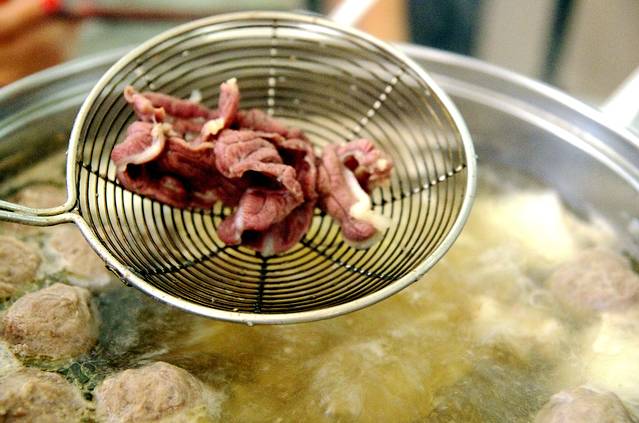 只见Gloria拿起镂空大勺,熟练地用筷子将各种部位的牛肉夹在大勺里面,让充满汕头风味的汤底将牛肉烫熟,鲜红色的牛肉瞬间呈现出鲜活诱人的暗红色。