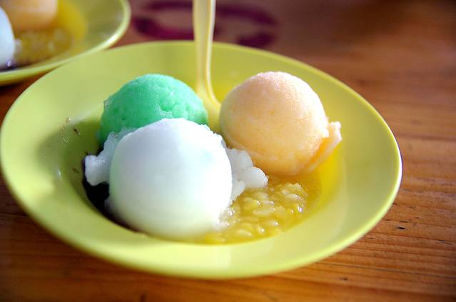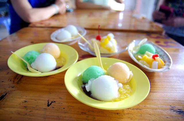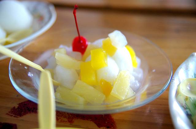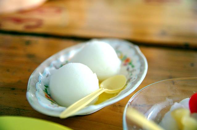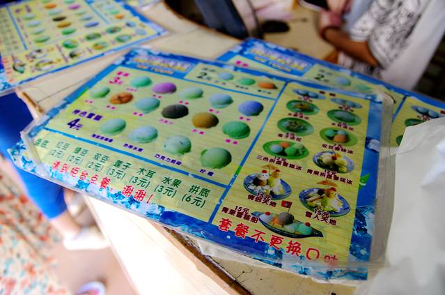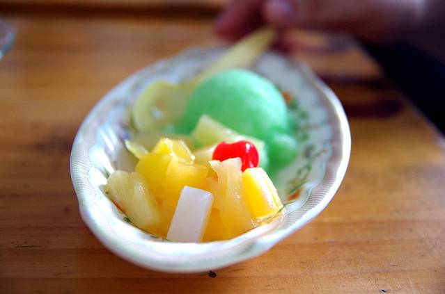简单的彩色塑料圆盘装盛,简易塑料勺,红豆绿豆或者罐头水果上铺上雪球,那么就是南海冰室的出品了。价钱很平民化,4元有一个单球,7元能有3 球了。味道方面可以选择白冰、薄荷、香橙的口味。我们6个人合计吃了29元。
