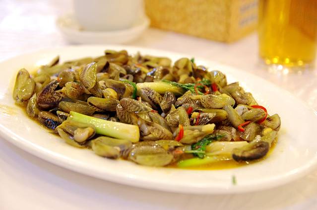 第二道菜金不换炒薄壳不一会儿功夫也在桌上来了。薄壳,是一种非蛤利也非圣子的水产品,体型比较娇小,薄壳肉大概跟黄豆大小差不多。潮汕人总会炒上那么一大盘端上餐桌,秉持着肉不是重点,味儿才是重点的原则,一颗接一颗地塞进嘴巴,吮吸其中的鲜甜,随意娴熟地吐出光壳,像吃瓜子一样,就这么默默地嗑出一座小山。