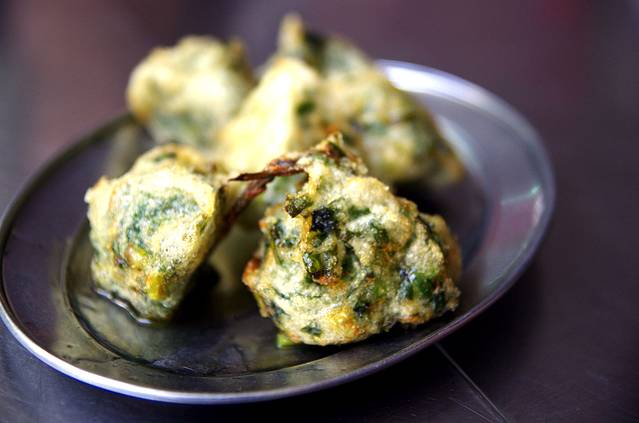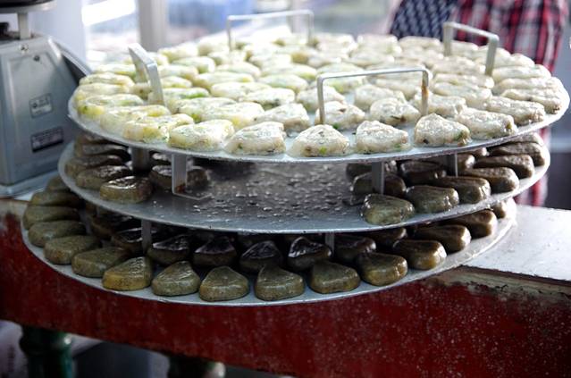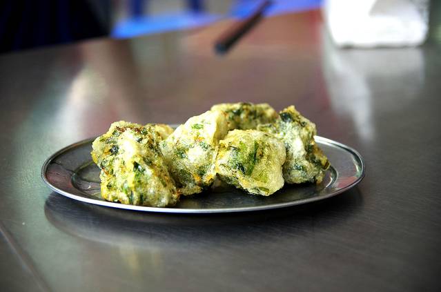无米粿,另一种比较有名的潮汕小吃,做法是用软糯的番薯粉做成粉皮,包裹着韭菜,用油在锅里煎,使其透明微带金黄色。虽然我个人对它不太感冒,总觉得韭菜的味道过于抢味,但是依然动摇不了潮汕人们对他的喜爱。