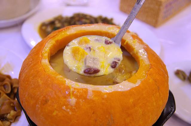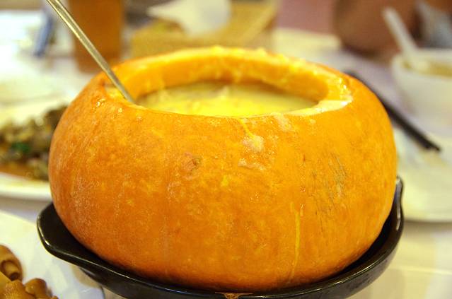 笋汤过后是别有一番滋味的南瓜羹。南瓜羹的外形极其吸引人,用一整个的南瓜将瓜肉挖空后,用椰汁、薏米、芋头等材料煮得粘稠的汤汁再倒回去南瓜里面。细腻香甜的味道和浓郁的椰奶香混在一起,让人无论是嘴里还是心情都是甜甜的。