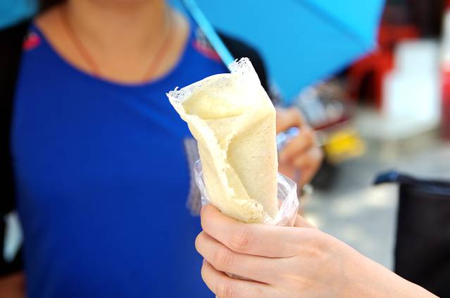 薄饼将糖葱包裹成像老北京鸡肉卷一样的长条形就大功告成了。据说这是很多潮汕人的童年回忆必有小吃。