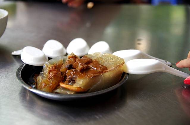 外表有些晶莹剔透又带着满满骨胶原感觉的鲎粿,让人意想不到的是吃进嘴里感觉跟萝卜糕有点像。