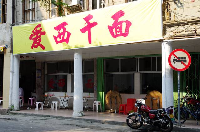 爱西干面店因附近都是拆迁的危楼,孤伶伶又落寞地屹立在小公园附近。