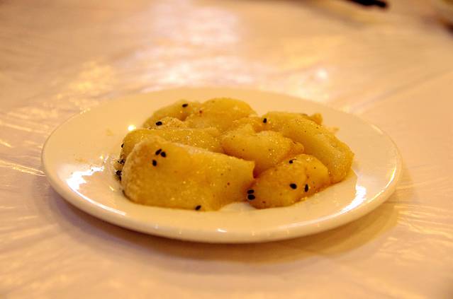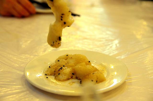 令我震撼的,还有光兴海鲜大排档的上菜速度。点菜后椅子还没有坐暖,免费赠送的餐前甜品“落汤钱”就上桌了。落汤钱是糯糖糍的谐音,味道上跟糯米糍也很相似,入口软糯香甜。