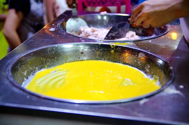 鲎粿,一般就是番薯粉为主料,加虾、蛋、香菇、鱿鱼等,先做成粿型蒸熟,再用油煮。