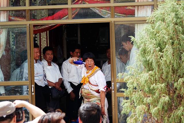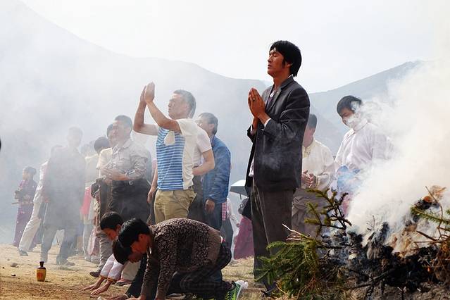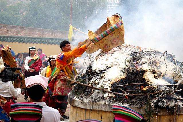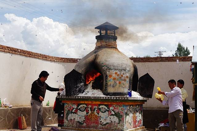 和酥油羊同时烧掉的还有大量的美丽的锦缎,酸奶,哈达,蜂蜜,水果和大量的粮食等贡品。 其品种之多,价值之高,连围观的老外(欧洲人)都心痛不已。