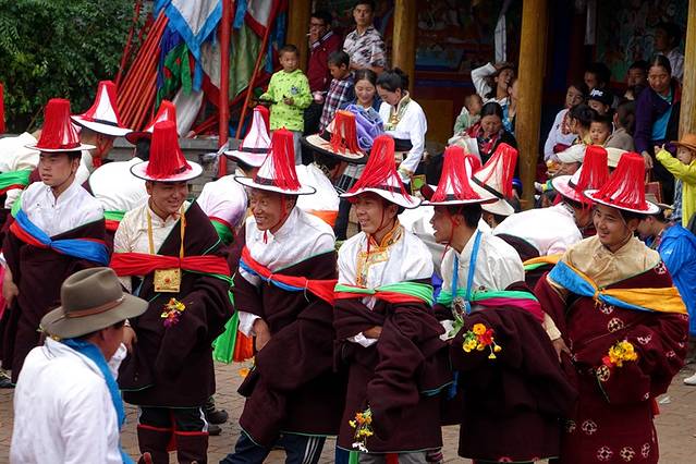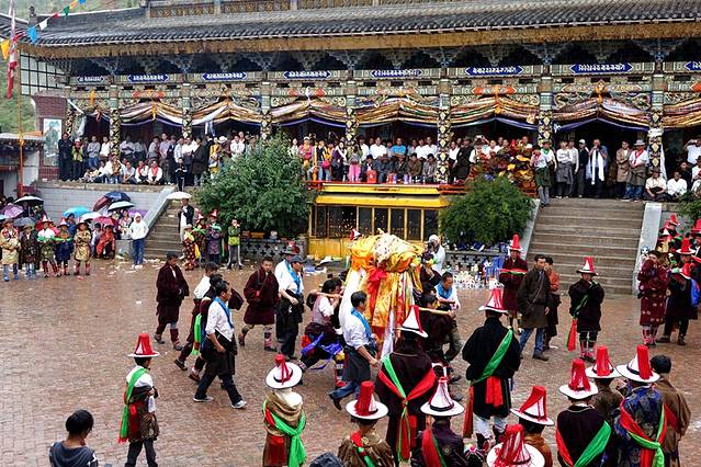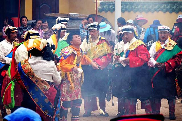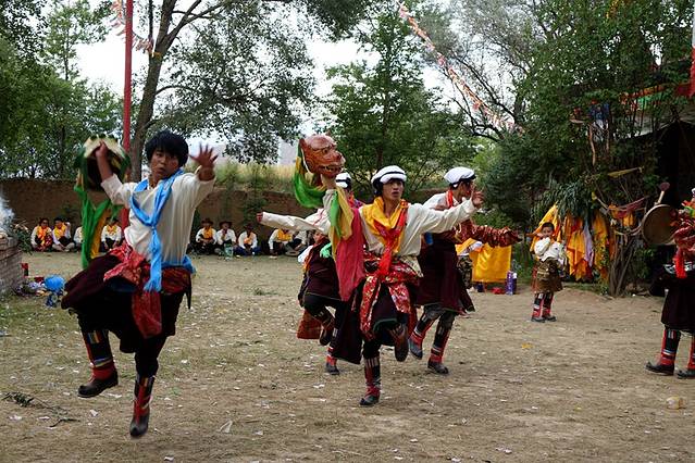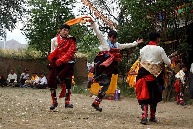 跳舞时,队伍由法师的独舞、领舞和舞队的分组舞、群体舞组成,一系列舞蹈节目之间则穿插着煨桑、献祭等祭神的活动。