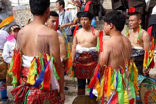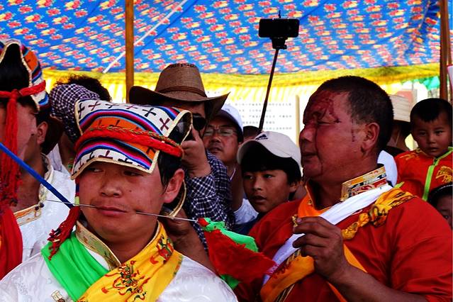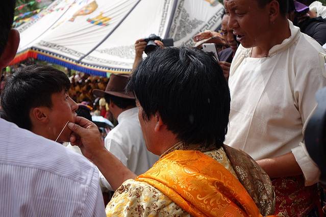 3、上口扦。上口扦是法师为自愿的年轻人在左右腮帮扎入钢针,插钎的意义在于,每插一根钎子,就代表了向神献祭了一只羊。