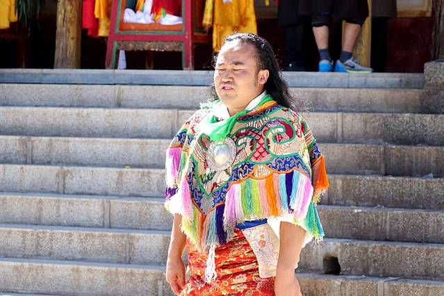 年都乎村的法师。法师在仪式开始时都要到神庙里经受“神灵上身”的惊人一幕。神庙内,只见法师在神像前突然全身一震,状甚痛苦,神智迷惘继而发狂,过一阵又猛然抖擞,威风上身,仿佛神力无边了。法师在神力附身之前,要经过痛苦的神灵上身仪式,甚至会昏厥。