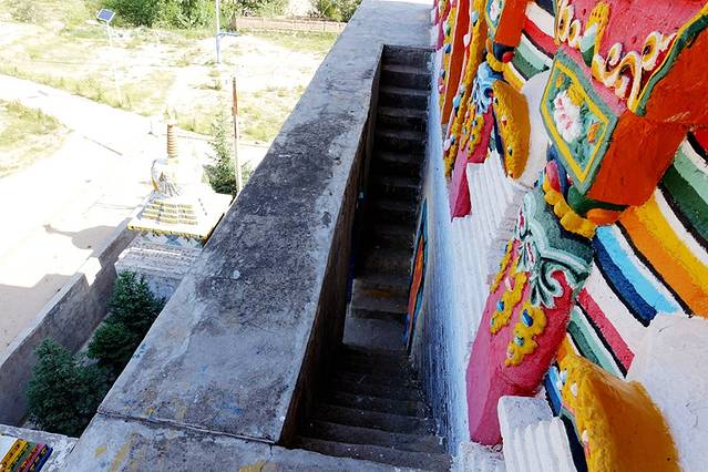 塔的造型结构独特,一般佛塔都是由内部沿楼梯上攀,而郭麻日塔每层顶檐较宽,可由内到外,由外到内地层层登顶。