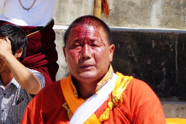 2、开山。开山是法师用刀划破自己的头顶,把鲜血撒向四面八方,这是一种古朴奇特的祭天方式,带着浓郁的古老“巫术”的气质。