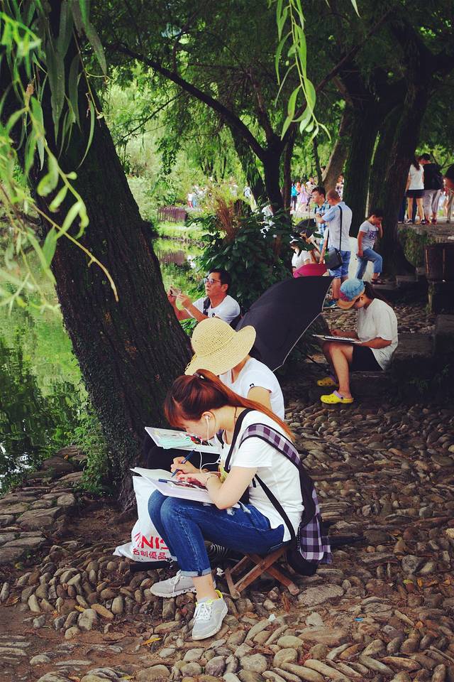南湖前一字排开 太多写生的学生专心写作 偶尔也会有摄影师架起脚架 耐心等待