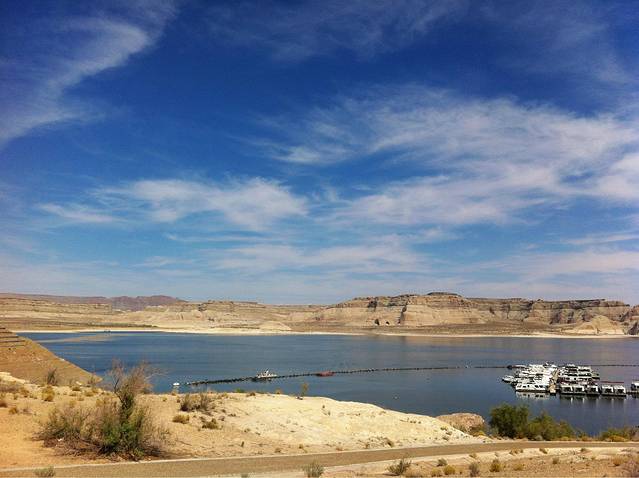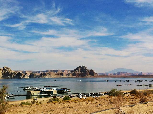 沙漠里一湖,马蹄湾出来去羚羊谷一定会经过,于是就进去开了一段,门票15刀,于是L说我这几张照片真心贵- -bbb 这湖据说也是老美一度假胜地,这我表示理解不能了。。。虽然放眼望去各种沙漠景象里突然有这么大一片湖水静静在那里的确是有点冲击。