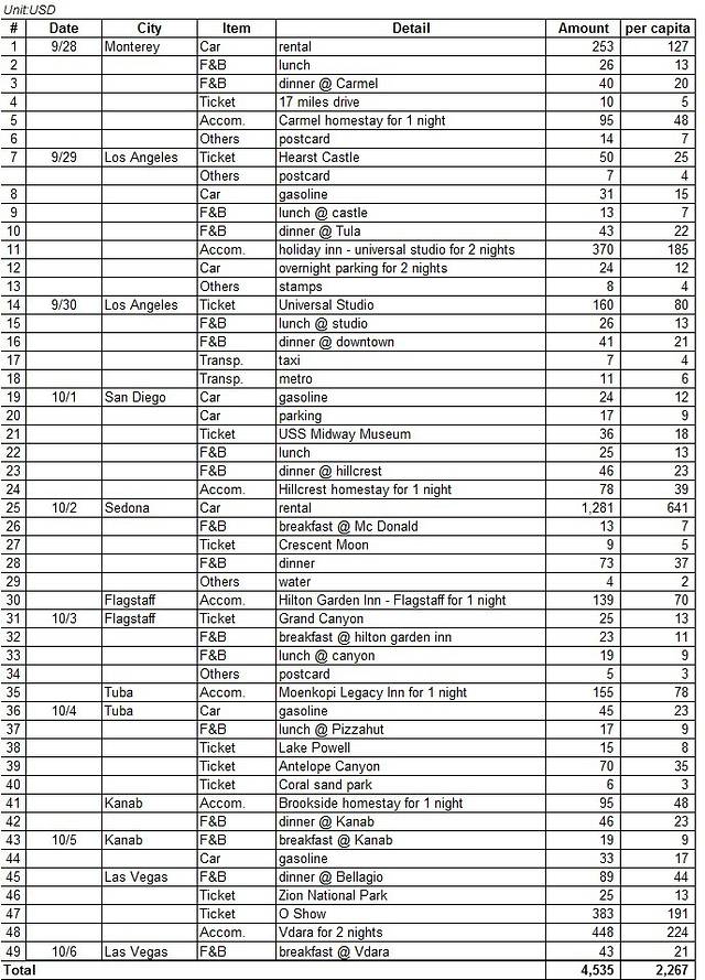 看透视图其实很容易看出来,大头是租车和住宿,因为我们全程没有住motel啦,所以不算便宜。其他吃喝玩乐真心觉得不贵,而且也都没亏待自己...laf....门票的话用人民币算就小贵了。