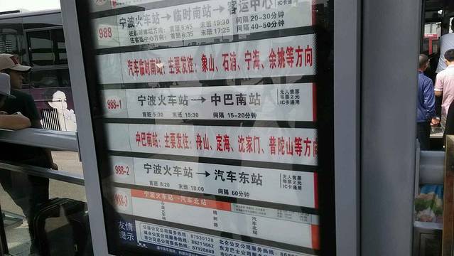 宁波火车站出站后,11:30在火车站广场内乘坐988-1公交车直达中巴南站,票价2元,车行约5分钟。