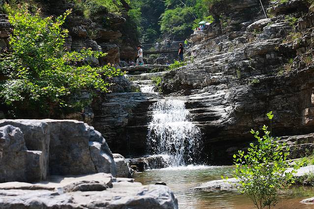 山中的溪水沿峡谷从高处流下,一路有很多断层,于是就有很多大大小小的瀑布,从下溯溪而上,沿途景色秀美,山水相映,可能是这里游人如织的原因之一吧。