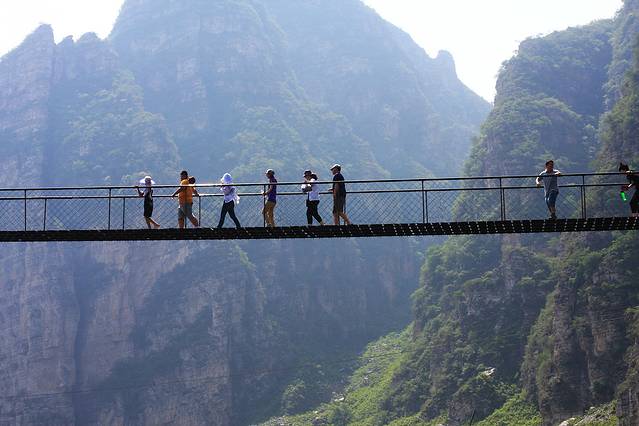 这种桥由于结构的原因,容易晃,虽然不严重,但对于胆小的也是个极大的考验,特别是赶上几个调皮的家伙拼命晃动,整个桥都是左右摇摆,很是吓人,我前面不远有个领着闺女的中年妇女几乎一步也走不动,明显感到腿在发软,如果不是有扶手可能会坐下去的,甚至闺女搀着也不行,后来来了一位工作人员搀扶着勉强能走。所以我前面说,这个景区的工作人员还是很赞的。
