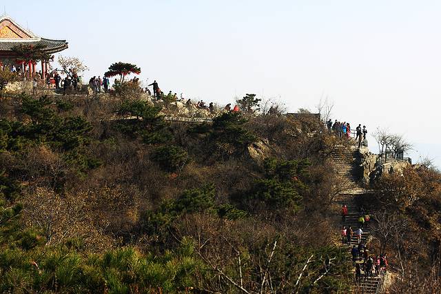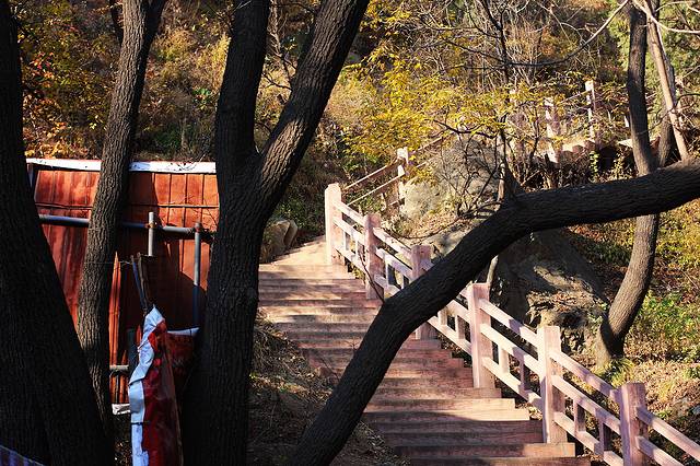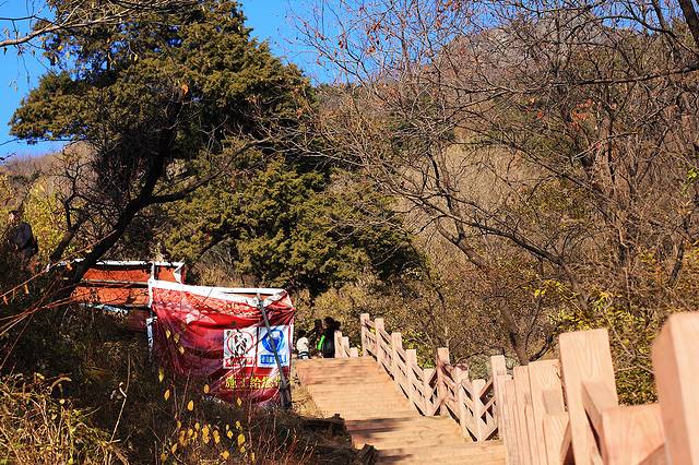 离开平台,没有跟着大多数人沿步道直接向上,而是转向左边,从去年新修的粉色台阶路爬山。