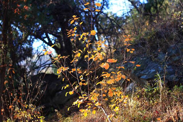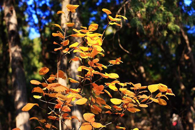 进门后从右边上山,走玉华岫方向,沿途偶有几株黄栌,夹杂着一些拍照的游客,在早上柔和的晨光中,相映成趣,画面感很强。