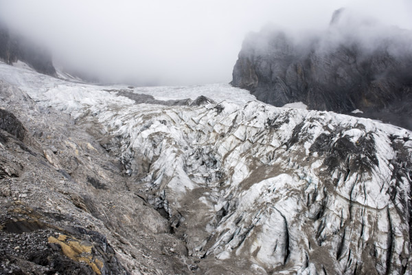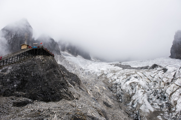 在离山顶只有一小段楼梯的时候,我突然发现远处似乎有点不一样,隐约能看到一点冰,然后渐渐地雾散开了,大面积的冰川突然出现在了面前,近在咫尺,引得游客一声声的欢呼。原来这才是你的真面目呀!
