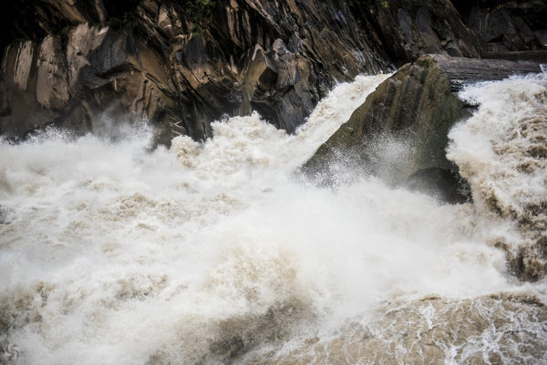 金沙江的水在流到这里突然变窄,加上江中有巨石阻拦,水流瞬间加速,气势磅礴,有吞没一切的力量,江中有块巨石,据说老虎跳在该石上,一跃就能到达江对面,故名虎跳峡。