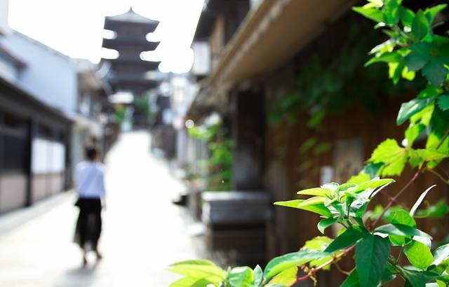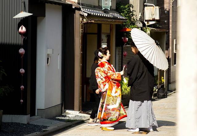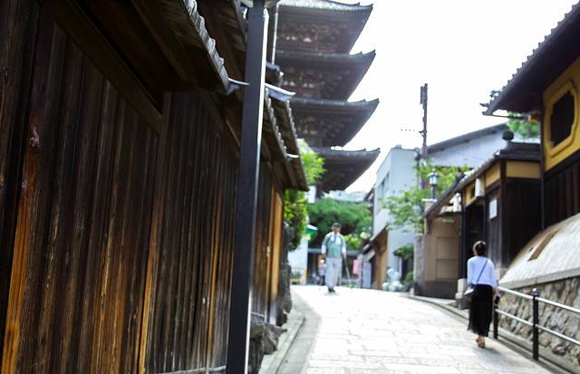 在京都,随处都可以看到身着传统和服的人们,精致的发髻、无懈可击的妆容。穿着木屐的情侣在树荫下漫步,女子的精致的刺绣手袋随之摇曳,在周围传统日式风格建筑下并没有任何的违和感。