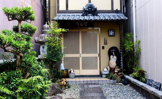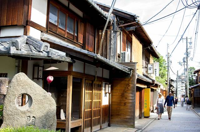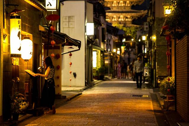 傍晚十分,行走在花见小路,就像村上春树笔下写到的 “走在撒满秋日阳光的花见小路上,看色彩浓郁的红叶优美地舞蹈着从空中飘飘忽忽地飘落在身上地上。偶尔,会有漂亮的和服女子从身边匆匆走过,木屐敲击地面发出清脆的响声。那声音由远及近,再渐行渐远,慢慢消失。只留下一片通明透亮的空寂。”仿佛时间倒退到几百年前。花见小路,这是一条由石板铺砌而成的古老而又神秘的小路,日本的艺妓就是发源于此。